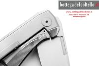 La lama è in acciaio CPM MagnaCut con finitura satinata dotata del sistema “ReF” (Removable Flipper system) applicato sulla nuova levetta minimale, il sistema di cuscinetti a sfera Double Crown e la clip in titanio Solida.