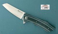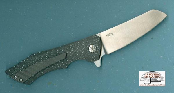 Il manico di questo coltello bello ed elegante è stato realizzato con il Tessuto Twill Bidirezionale composto da fibra di carbonio con tramatura in titanio. Normalmente questo materiale viene lavorato solo sul piano, mentre per realizzare questo coltello sono stati arrotondati i bordi. Ed essendo ogni manico realizzato a mano la tramatura del materiale (filamenti di titanio) è sempre diversa ed è possibile che fuoriescano dei filamenti; il pezzetto di carta vetrata grana 400 inserito nella confezione serve proprio a carteggiare eventuali filamenti. Questo materiale molto tecnologico conferisce modernità e unicità al coltello in quanto ogni impugnatura è diversa dall'altra. Carbon fiber lightning strike silver. La lama è in acciaio inossidabile N-690 realizzata con la metallurgia delle polveri e riesce ad ottenere la durezza di 59/60 Hrc che permette di mantenere più a lungo il filo della lama. Per il sistema di apertura "Flipper" sono stati utilizzati dei cuscinetti reggispinta totalmente inossidabili. Modello 378/CT AM-2. Fodero: nylon nero. Clip: carbonio. Lunghezza totale 220 mm, lunghezza lama 90 mm, peso circa 160 gr. Confezione: scatola di cartoncino nero.