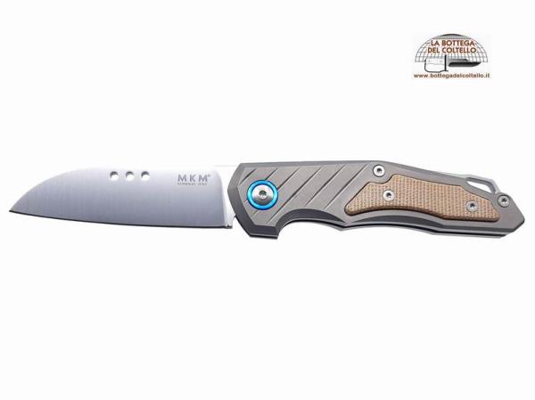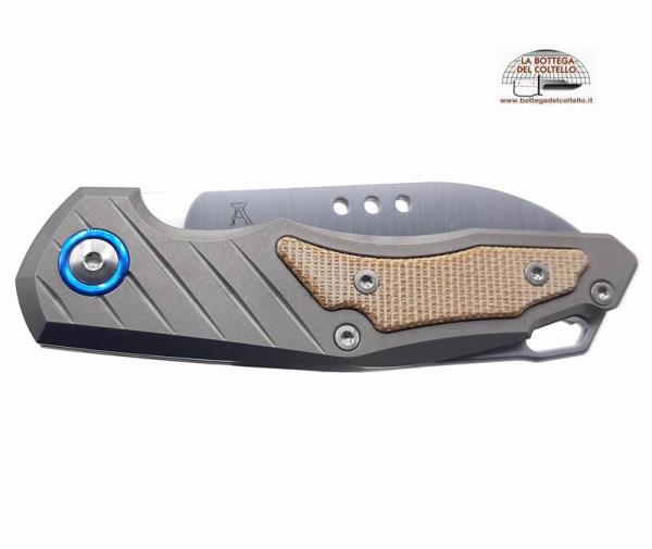 MKM Maniago Knife Makers Ref. MK RT-NCT Coltello chiudibile slip joint con lama in acciaio Bohler M390 satinata, e manico in titanio Ti6AI4V sabbiato con inserto in canvas micarta naturale. I tre fori sulla lama, posizionati nel punto di leva migliore per un'apertura più agevole, sostituiscono la classica "unghia" d'apertura oltre a renderlo più contemporaneo e accattivante. Molla e viteria in acciaio inox. Venduto con fodero in pelle con clip magnetica.