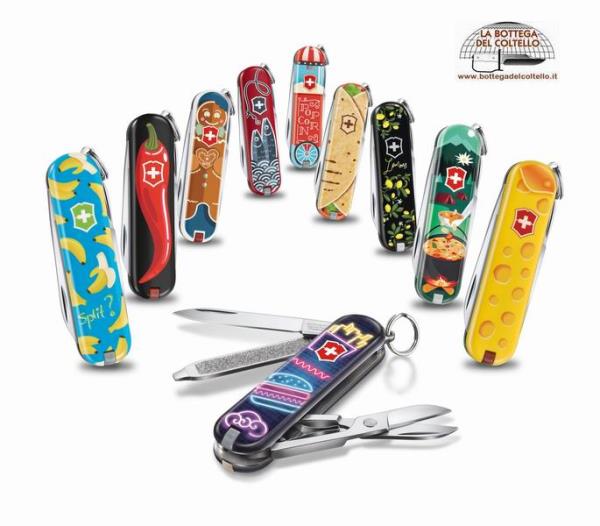 Victorinox Classic Limited Edition 2019 - Serie completa di dieci piccoli multiuso con le decorazioni ispirate al tema “Cibo del mondo”. Confezione: scatoletta di cartoncino.