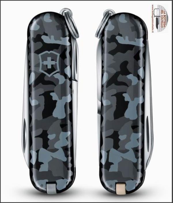 Victorinox Art. 0.6223.942 Classic Navy Camouflage Multiuso mini. Funzioni: lama piccola, forbici, lima per unghie, cacciavite 2,5 mm, anello portachiavi, stuzzicadenti, pinzette. Dimensioni: altezza 9 mm, lunghezza 58 mm, peso 21 gr. Guancette in ABS/Cellidor. Confezione: foderino.