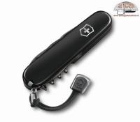 Victorinox Svizzera Art. 1.3603.3P Multiuso monocromatico con strumenti neri. Gli strumenti vantano uno speciale rivestimento che cambia aspetto in base a come lo colpisce la luce, passando dal grigio scuro all’antracite, con un’esclusiva finitura superficiale che brilla ed è liscia come uno specchio. Il laccetto e le guancette nere completano questa versione monocromatica dello Swiss Army Knife. Strumenti: stuzzicadenti, pinzetta, lama grande, lama piccola, apriscatole, cacciavite 3 mm, apribottiglie, cacciavite 6 mm, spelafili, alesatore, perforatore e punteruolo da cucito, cavatappi, anello portachiavi. Dimensioni: altezza 14.5 mm, lunghezza 91 mm, peso 58 g. Materiale guancette: ABS/Cellidor. Confezione: scatola di cartoncino.