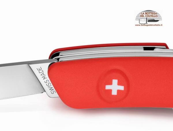Il coltello multi-funzione SWIZA D03 codice KNI.0030.1000 color ROSSO SWIZA comprende: lama (440 - 57 HRC) da 75 mm con sistema di bloccaggio che si attiva premendo l'icona a croce SWIZA; alesatore e punteruolo da cucito con asola, levacapsule con cacciavite a testa piatta N° 3, piega fili, apriscatole con cacciavite a testa piatta N° 1, cavatappi e pinzetta. Lunghezza totale mm 165, chiuso mm 95. Confezione: scatoletta di plastica.