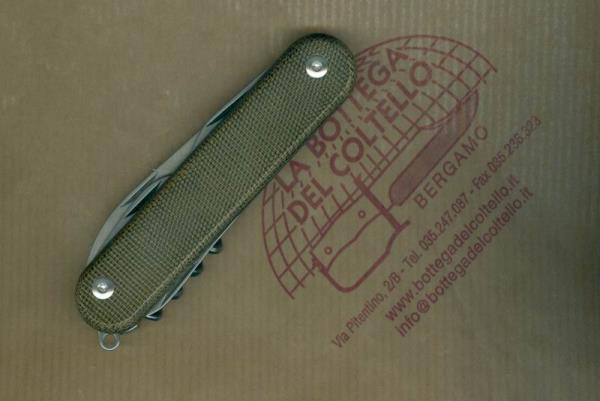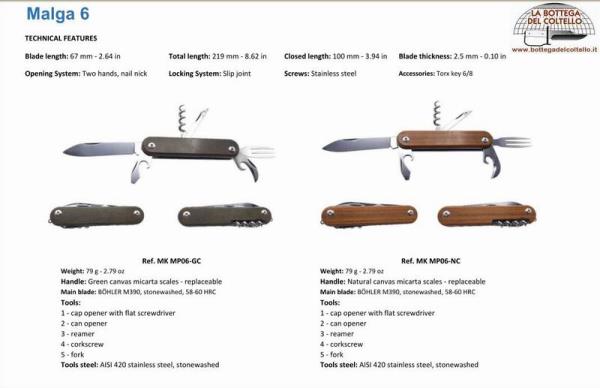 CARATTERISTICHE TECNICHE: Lunghezza lama: 67 mm, 2,64" - Lunghezza totale: 219 mm, 8,62"- Lunghezza chiuso: 100 mm, 3,94" - Spessore lama: 2,5 mm, 0,10" - Sistema di apertura: due mani, nail nick - Sistema di bloccaggio: slip joint - Viti: acciaio inossidabile - Accessori: chiave torx 6/8 - Peso: 79g, 2.79oz - Impugnatura: micarta verde- Lama principale: acciaio Bohler M390, 58-60 HRC - UTENSILI: apribottiglia con cacciavite piatto, aprilattine, alesatore, cavatappi, forchetta - Materiale utensili: acciaio inossidabile AISI420, stonewashed. Confezione: scatola di cartoncino.