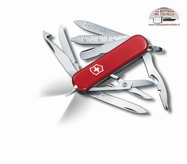Victorinox Midnite Mini Champ V-0.63 86 contiene lama, forbici, lima per unghie con pulisci unghie, spingi pelle, cacciavite con righello, lama apri lettere, pela arance con raschietto, levacapsule con cacciavite magnetico a croce e spelafili, anello portachiavi, LED, biro.