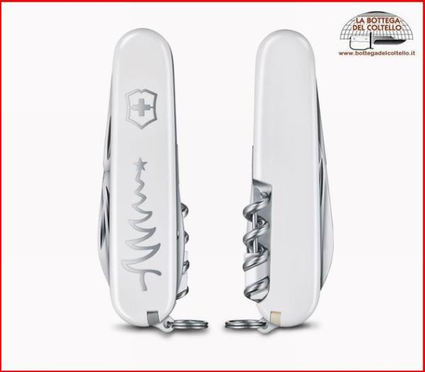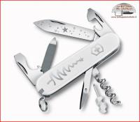 Art. 0.3804.77 Edizione limitata a 15.000 pezzi in tutto il mondo. Dimensioni: altezza 15 mm, lunghezza 84 mm, peso 52 g. 13 funzioni: lama; apriscatole; cacciavite 3 mm; apribottiglie; spelafili; cacciavite 6 mm; alesatore, perforatore e punteruolo da cucito; cavatappi;lima per unghie; pulisci - unghie; stuzzicadenti; pinzette; anello portachiavi. Guancette in ABS/Cellidor. Confezione: scatola di plastica.