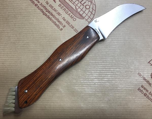 Boletus, coltello per funghi con lama e pennellino richiudibili. Sistema di tenuta in apertura "rolling" elaborato da Silvester. Lama in acciaio inox Buderus NITRO B HRC 58/59. Guancette in Pao santo. Lunghezza totale cm. 19, lama cm 7, chiuso cm 11.