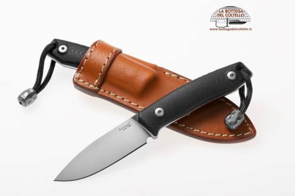 Coltelli outdoor prodotti in Italia da Lionsteel. Questo M1 BK è un coltello di dimensioni contenute, dotato di un cordino con perlina in titanio.