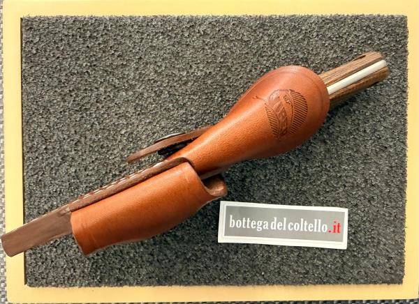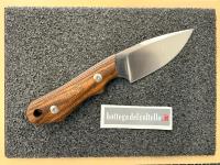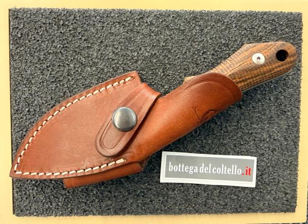 Coltello a lama fissa di 4 mm di spessore. Lama in acciaio CPM MagnaCut satin finish . Guancette in legno Bocote lavorata 3D. Codolo manico affusolato verso retro. Questo coltello viene fornito con un fodero in vero cuoio