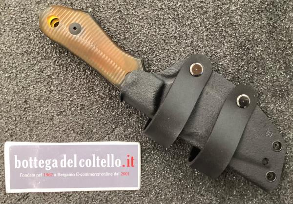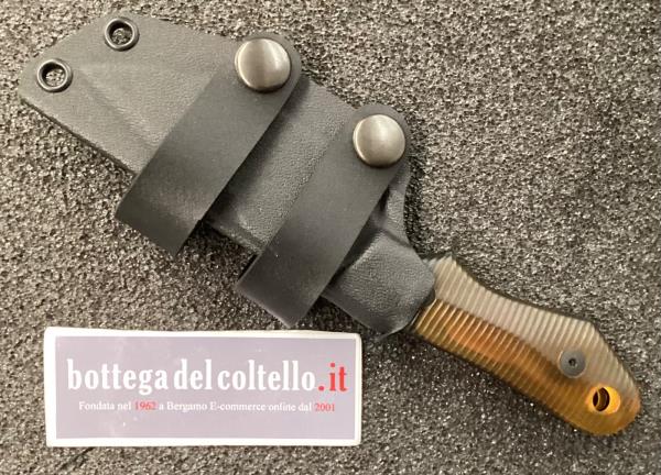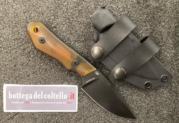Coltello a lama fissa di 4 mm di spessore. Lama in acciaio CPM MagnaCut dark stone washed. Guancette in resina ignifuga ULTEM™ lavorate in 3D. Codolo manico affusolato verso retro. Questo coltello viene fornito con un fodero in Kydex