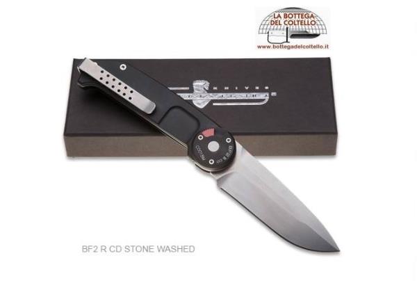 L'art. BF2 R CD stone washed cod. 000.04.1000.0490/SW qui proposto ha le seguenti caratteristiche pubblicate dal produttore: Peso: g. 140 oz.4,93 - Lunghezza lama: mm 90 in 3,54 - Lunghezza totale: mm 215 in 8,46 - Spessore lama: mm 3 in 0,11 - Materiale Lama: acciaio Böhler N690 (58HRC) - Finitura lama: stone washed - Punta: DROP - Arrotatura lama: filo piano - Materiale impugnatura: alluminio anticorodal anodizzato. Confezione: scatola di cartoncino.