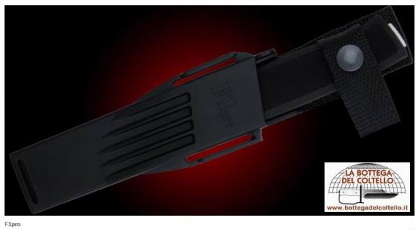 F1PRO: Lunghezza totale mm 217 - Lunghezza lama mm 100 - Spessore lama mm 5 - Profilo lama convesso - Peso (coltello) 182g - Acciaio Lam.CoS - Durezza (HRC) 60 - Materiale manico Thermorun - Fodero Zytel. Il coltello è contenuto in una robusta custodia nera, impermeabile e resistente agli urti, che può essere utilizzata per lo stoccaggio di telefoni, GPS, documenti, attrezzi di salvataggio e molto altro ancora.