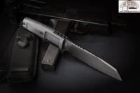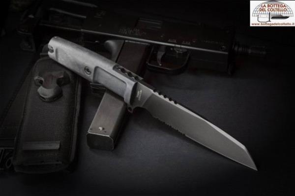 La lama è parzialmente simmetrica. La parte incavata della lama dopo la guardia, che separa la parte affilata dal manico, è stata realizzata per l’alloggio del dito indice durante l’utilizzo, creando un punto di grip vicino alla parte affilata per un miglior controllo durante l’utilizzo del coltello. Questa caratteristica, insieme al grip d’appoggio sul dorso del coltello, permette una miglior presa evitando al contempo lo scivolamento della mano sulla lama. In questo modo è possibile effettuare la maggior parte dei lavori di taglio con una pressione superiore. Scheda tecnica pubblicata dal produttore: Peso g.:262 Peso oz.:9,2 Lunghezza Lama (mm):160 Lunghezza Lama (in):6,3 Lunghezza Totale (mm):290 Lunghezza Totale (in):11,4 Spessore Lama (mm):6,3 Spessore Lama (in):0,25 Materiale Lama :ACCIAIO BöHLER N690 (58HRC) Finitura Lama:BRUNITURA MIL-C-13924 Arrotatura Lama:FILO PIANO Dentatura Parziale (in):1,6 Dentatura Parziale (mm):40 Materiale Impugnatura:FORPRENE.