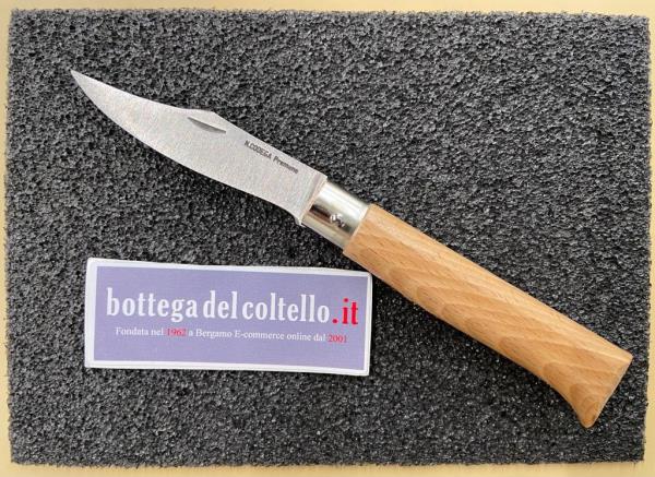 Il coltello è prodotto con impugnatura di faggio e carpino: viene venduto con venatura e legno a seconda della disponibilità. Dimensioni: lunghezza totale mm 190, lama mm 85, chiuso mm 110, peso gr 38. Acciaio al carbonio. Senza blocco lama. Le possibili imperfezioni o imprecisioni lavorative, sono comprensibili conseguenze dell'economica elaborazione rustica e tradizionale.