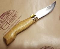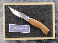 Lama in acciaio inossidabile Sandvik 12C27, blocco lama, impugnatura in legno di maggiociondolo, ghiuera di blocco in mettallo color ottone o cromato a seconda della disponibilità. Lunghezza totale mm 205, lama mm 90, chiuso mm 115.