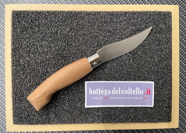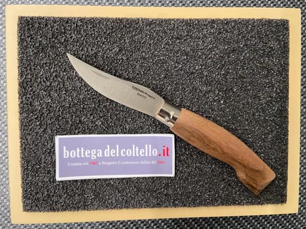 Lama in acciaio inossidabile senza blocco in apertura, impugnatura in legno di noce. Lunghezza totale cm 18, lama cm 8, chiuso cm 10. L'impugnatura può avere striature naturali diverse da quelle riprodotte nell'immagine. Le possibili imperfezioni o imprecisioni lavorative, sono comprensibili conseguenze dell'economica elaborazione rustica e tradizionale.