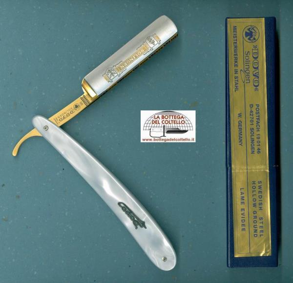 MODELLO DI RASOIO PRODOTTO A SOLINGEN, LAMA CONCAVA 5/8". ACCIAIO NON INOSSIDABILE. MANICO IN MATERIALE SINTETICO IMITAZIONE MADREPERLA.