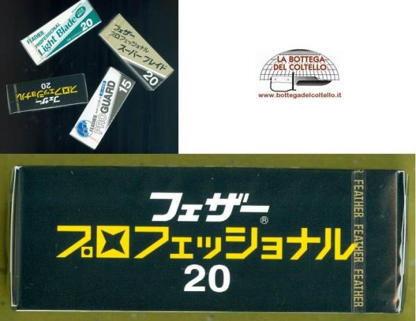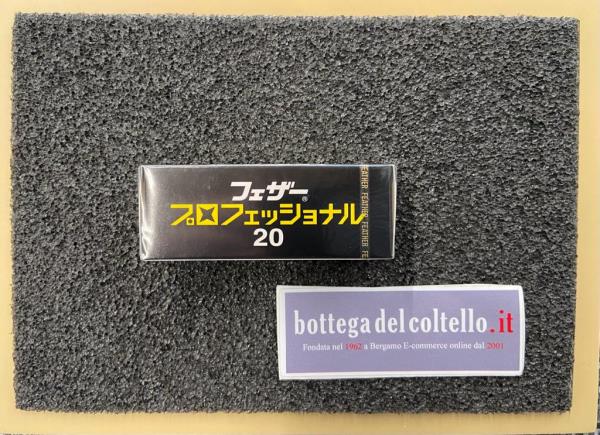 20 lamette professionali PB-20, le lamette standard per rasoi Feather indicate per ogni tipo di barba. Dimensioni: mm 50 x 8; spessore mm 0.254. Utilizzando i rasoi Artist Club modello shavette l'esposizione della lama è di 1,2 mm.