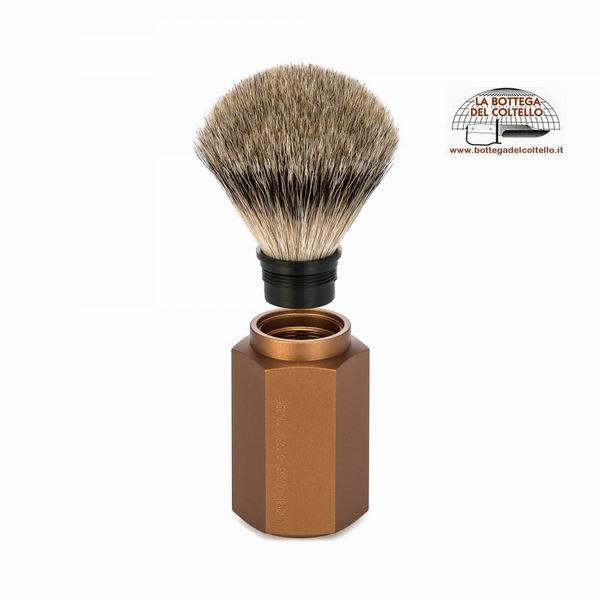 Muhle art. 091 M HXG BRONZE Pennello per barba con ciuffo intercambiabile in tasso argentato. Misure: impugnatura 55 mm x 32 mm - peso: 127 g - misura dell'anello M: 21 mm. Manico in alluminio anodizzato color bronzo. Confezione: cilindro di cartoncino.