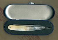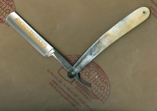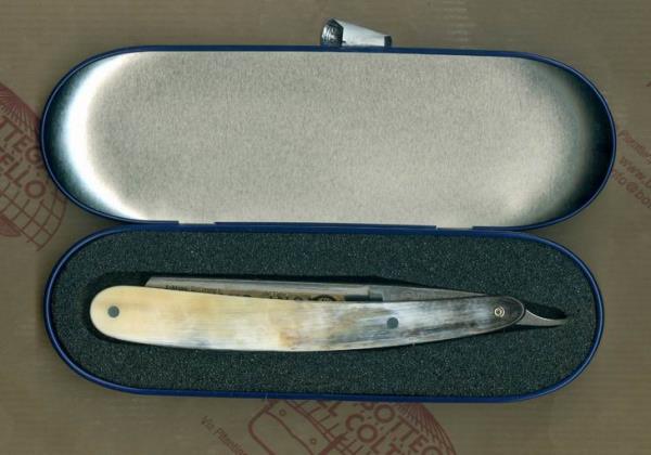 Per i rasoi da barba a mano libera la larghezza della lama è espressa in ottavi di pollice. Sono considerate ottimali ai fini del risultato le larghezze 4/8, 5/8 e 6/8; sono difficilmente reperibili larghezze maggiori. Questo art. 41 5855 ha una larghezza di 5/8 e deve essere periodicamente riaffilato. Lama in acciaio inossidabile, impugnatura in corno, contenitore in metallo. L'impugnatura può avere striature naturali diverse da quelle riprodotte nell'immagine.