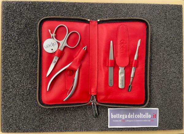 Alpen set manicure, pelle color rosso, con forbice per unghie mani, tronchesina per cuticole, spingipelle doppio, lima diamantata, pinzetta obliqua.