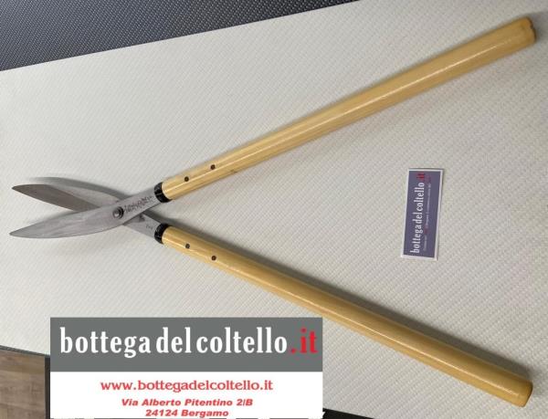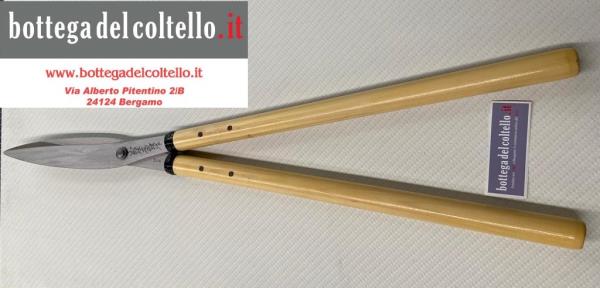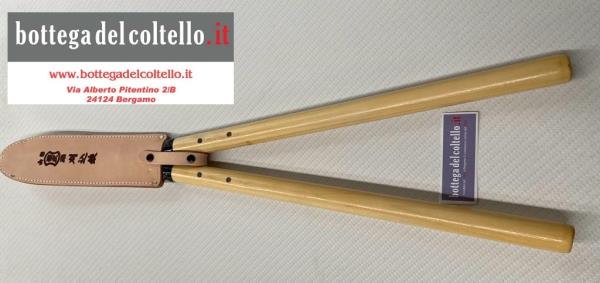 Leggerissima, solo 730 grammi ( fodero in dotazione scluso) lunga in totale cm.71 Karikomi Yamagata ha una superficie di taglio di 17 cm circa, i manici in legno di magnolia sono lunghi cm.45 ed hanno anelli in metallo che danno robustezza al manico nella giunzione tra lame e manico, fuzionano anche come battenti fine corsa delle lame.