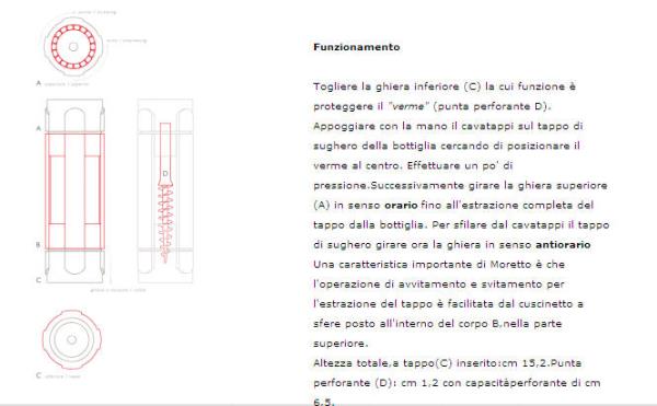 Moretto Cavatappi è composto da 3 pezzi assemblati che costituiscono il corpo centrale (A+B+C) e la parte motrice (A+B) interamente in Alluminio. La punta perforante (D) è in Acciaio rivestita con un trattamento in Cromatura idoneo per gli alimenti. Confezione: bussolotto di latta.
