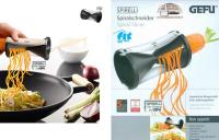 Art. 13460 Spirelli originale da GEFU consente di ottenere spirali di 2x3 mm o 3,5x5 mm, adatte alla creazione di verdure arrostite in padella o da abbinare a piatti di pasta o altro, come suggerisce la fantasia. Lama in acciaio inossidabile giapponese. Diametro verdure: 20 mm - 54 mm. Confezione: scatola di cartoncino.