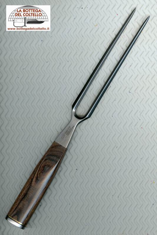 Acciaio inossidabile VG-10. Lunghezza rebbi cm 16, manico cm 12. Scatola di legno.