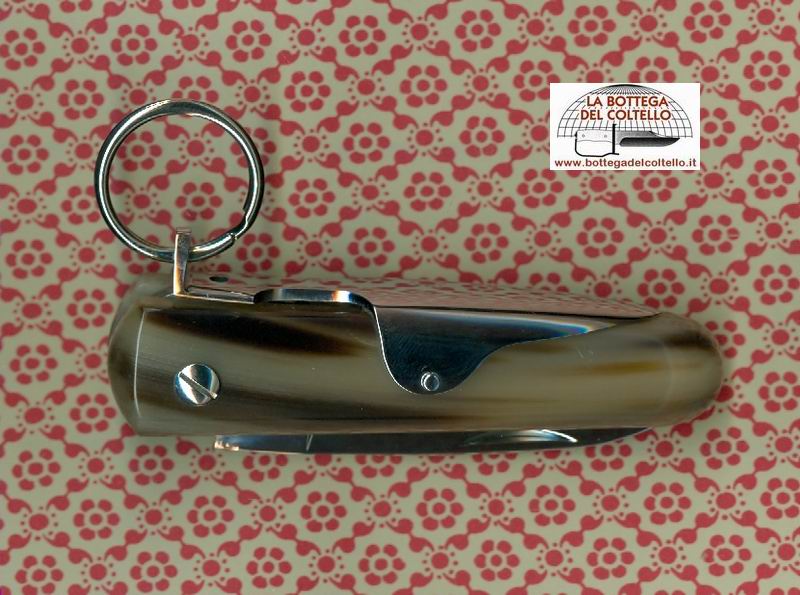 Impugnatura in corno biondo, lama in acciaio inossidabile, finitura a specchio. Dimensioni ~: lunghezza totale mm 130, lama mm 50, chiuso mm 80. L'impugnatura può avere striature naturali diverse da quelle riprodotte nell'immagine. Confezione: foderino scamosciato.