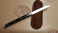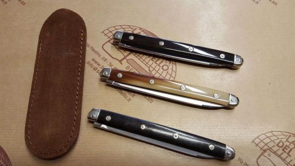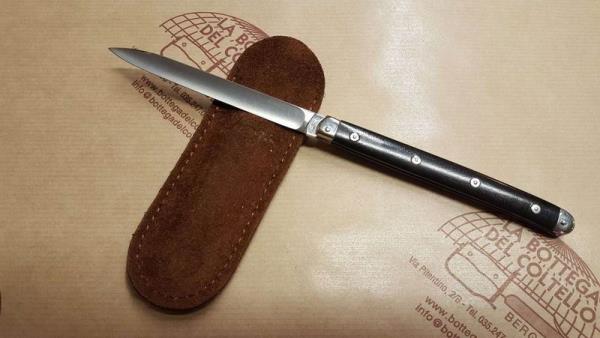 Lama in acciaio inossidabile satinata. Dimensioni ~: lunghezza totale mm 215, lama mm 100, chiuso mm 115, peso gr 45. Lama senza blocco in apertura e chiusura, simile ad uno slipjoint moderno. Confezione: foderino scamosciato.