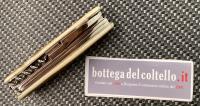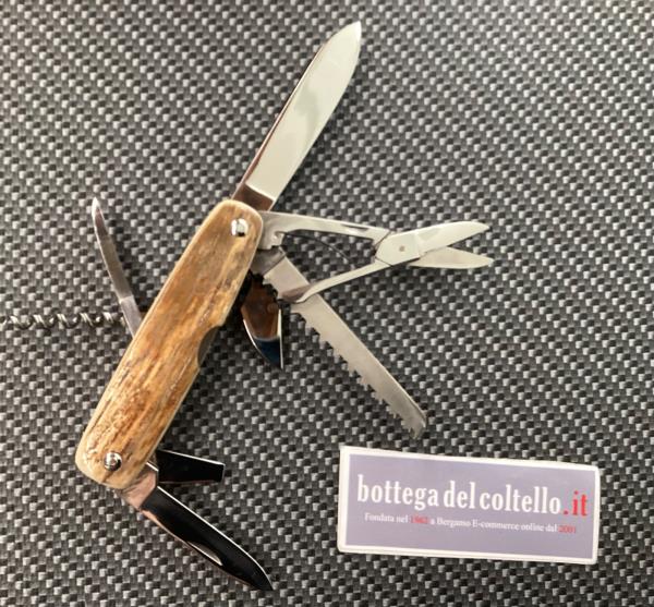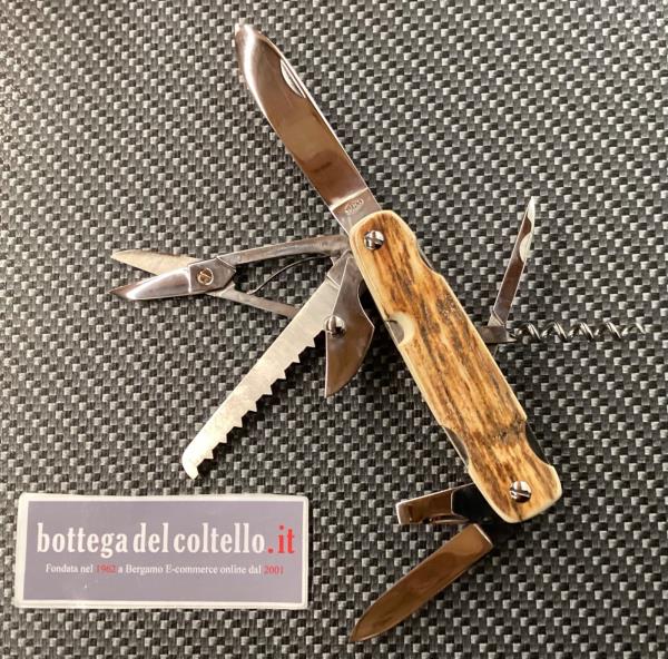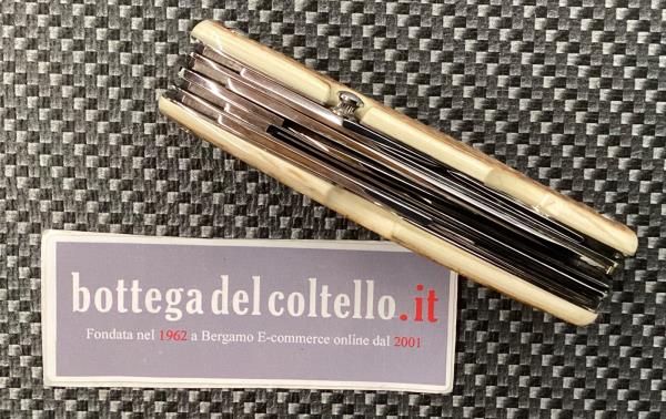 Le lame e gli altri utensili sono in acciaio inossidabile, l'impugnatura è in avorio fossile di mammut. Dimensioni: chiuso cm 10, lama grande cm 8; peso gr 186. Confezione: foderino. Realizzato dalla coltelleria d'arte fondata da Jacques Mongin, le apparenti imperfezioni che si possono trovare in alcuni dettagli sono solo la conferma dell'esecuzione artigianale. L'impugnatura può avere striature naturali diverse da quelle riprodotte nell'immagine.
