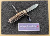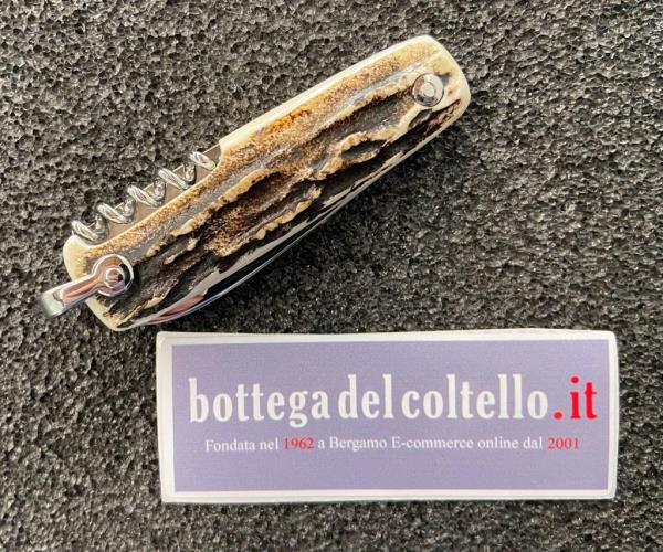 3 usi. La lama e le altre funzioni sono in acciaio inossidabile, l'impugnatura in corno di cervo. Dimensioni: chiuso mm 80, peso gr 80. Confezione: foderino J. Mongin. L'impugnatura può avere striature naturali diverse da quelle riprodotte nell'immagine.