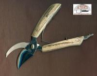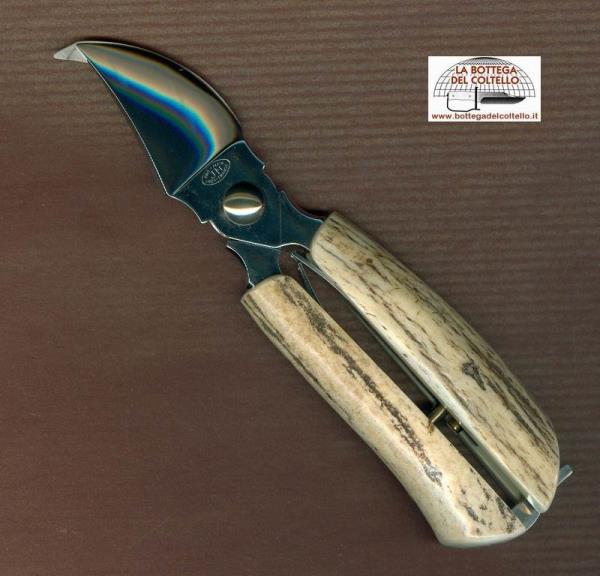 Lame e finiture in acciaio inossidabile. Impugnature in corno di cervo. Lunghezza totale mm 145. Sistema di molla interna e blocco forbice chiusa con levetta sul fondo dell'impugnatura. Le apparenti imperfezioni che si possono trovare in alcuni dettagli sono solo la conferma dell'esecuzione artigianale. L'impugnatura può avere striature naturali diverse da quelle riprodotte nell'immagine.