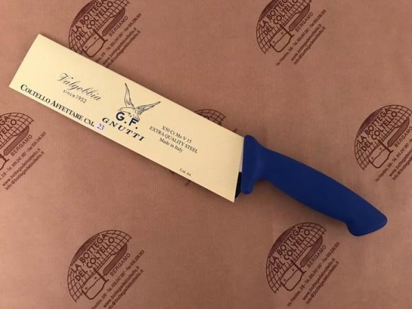Coltelleria Valgobbia, Lumezzane (BS) Art. CP.01.AF23 Coltello per affettare con una forma simile al coltello francese, ma con una lama di altezza maggiorata al fine di sostenere la carne nell'esecuzione di un taglio più profondo. Lama lucida - Lunghezza lama 23 cm - Impugnatura protetta blu.