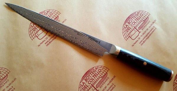 Modello Sujihiki. Articolo 34680-241. Lunghezza lama mm 240. Lama con design damasco a 49 strati, cuore in acciaio FC 61. Impugnatura in pakkawood. Confezione: scatola di plastica e cartoncino. No lavastoviglie!