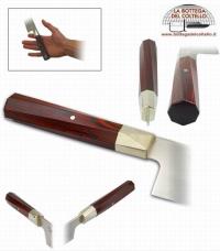 Lama in acciaio inossidabile VG-10 lunga cm 24. Affilatura leggermente asimmetrica (Hamaguri) per utilizzo con la mano destra. Impugnatura ottagonale in pakkawood sezione ellittica. Tipica confezione giapponese in legno.