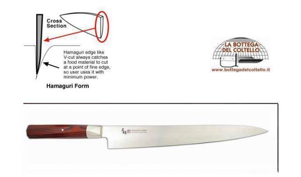 Lama in acciaio inossidabile VG-10 lunga cm 27. Affilatura leggermente asimmetrica (Hamaguri) per utilizzo con la mano destra. Impugnatura ottagonale in pakkawood sezione ellittica. Tipica confezione giapponese in legno.