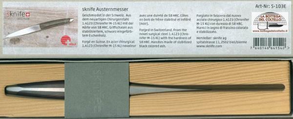 Art-Nr: S-103E Forgiato in Svizzera dal nuovo acciaio chirurgico al nitrogeno 1.4123 (Chronifer M-15 KL) con durezza di 58 HRC. Manico in legno di frassino colorato e stabilizzato. Lunghezza totale mm 190, lama mm 90. Supporto in legno. Confezione: scatola di cartoncino. Le striature naturali possono essere diverse da quelle riprodotte nell'immagine.