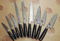 Serie Miyabi 5000FCD sviluppata in collaborazione con Rokusaburo Michiba da Zwilling J.A. Henckels Japan. Articolo 34686-241. Lunghezza lama mm 240. Lama con design damasco a 49 strati, cuore in acciaio FC 61. Impugnatura in pakkawood. Confezione: scatola di plastica e cartoncino. No lavastoviglie!