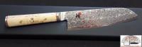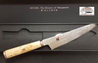 Questo coltello della serie 5000 MCD è caratterizzato da: lama con bellissima lavorazione in damasco inossidabile 101 strati, tagliente in SG2 (metallurgia delle polveri); raffinata impugnatura in legno di betulla impreziosita da un inserto a mosaico; parte terminale del manico decorata con il logo Miyabi. Ogni coltello è rifinito a mano nello stile honbazuke nella fabbrica di Seki, Giappone.