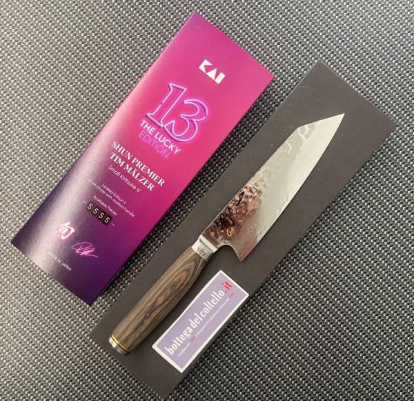 Kai Corporation Art. TDM-1784 Kiritsuke Questo coltello non passa certo inosservato, con i suoi 15 cm di lama con l'inconfondibile superficie martellata tipica della serie Shun Premier Tim Mälzer. Inoltre, il coltello porta anche l'esclusivo logo 13 The lucky Edition e la firma di Tim Mälzer. Ogni esemplare ha il proprio numero di serie inciso sul manico, che è opaco e lungo 12cm.