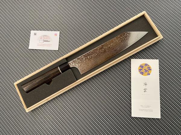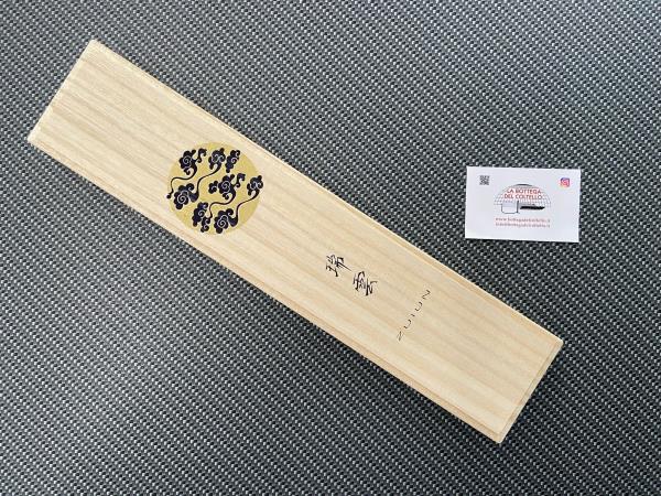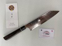 L'uso dell'acciaio della migliore qualità supera i quattro standard principali nella produzione di lame di alta qualità: alto grado di durezza, tenacia, durata e resistenza alla corrosione. Specifiche tecniche pubblicate dal produttore: Lama: SPG2 “Acciaio Damasco” - Manico: legno laminato rinforzato - Lunghezza lama 8 1/4 in. 207 mm. lunghezza totale 360 mm - Fatto a mano a Seki-city, Giappone - Si consiglia il lavaggio a mano. La sagoma della punta è assimilabile al Kiritsuke.