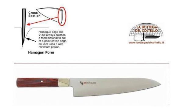 Lama in acciaio inossidabile VG-10, lunghezza lama mm 210. Affilatura leggermente asimmetrica (Hamaguri) per utilizzo con la mano destra. Impugnatura ottagonale in pakkawood sezione ellittica. Tipica confezione giapponese in legno.