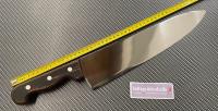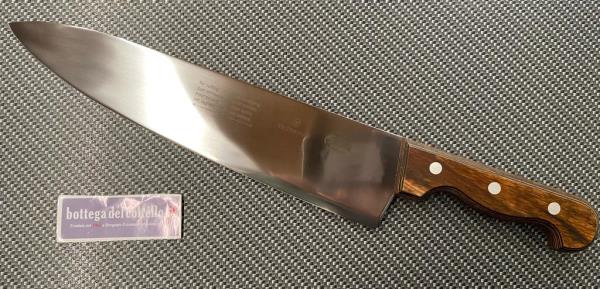 Questo coltello pesante - detto "da colpo e mezzo colpo" - adatto al taglio delle ossa ( parte di lama dal manico a metà lama circa) e taglio delle carni ( parte da metà lama circa, fino alla punta), un buon supporto cuochi e macellai nel taglio di parti con ossa e carne vicine ( esempio nodini di vitello o braciole di maiale), valido anche per certe tipologie di grossi pesci ha la lama lunga cm. 33, l'impugnatura in pakkawood e pesa gr. 800. Art. 5.3900.33 evitare di battere sul dorso della lama, con martelli, mazzuoli o batticarne, le vobrazioni potrebbero rompere l'impugnatura.