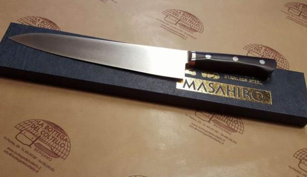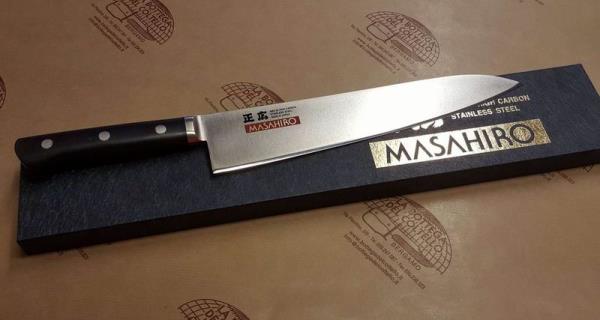 Coltello Masahiro 14913 MV-H Coltello per cuoco, lunghezza lama 270 mm. I coltelli da cucina Masahiro sono realizzati in acciaio inossidabile originale Masahiro MBS-26 (carbonio contenuto 0,85-0,95%); la lama del coltello è trattata in 3 fasi - tempra, rinvenimento e distensione - e l'acciaio inossidabile diventa incredibilmente duro con HRC da 58 a 59. Ogni lama di coltello è affilata perfettamente da artigiani con più di 30 anni di esperienza. L'impugnatura è realizzata in POM, materiale straordinariamente resistente e antibatterico che rende il coltello molto igienico nell'uso quotidiano. Confezione: scatola di cartone.