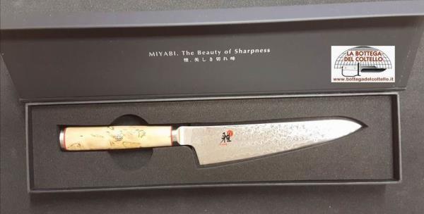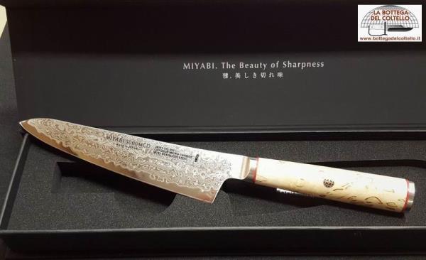 Lama damasco inox 101 strati e impugnatura in legno di betulla caratterizzano questo coltello Miyabi da preparazione della serie 5000MCD.