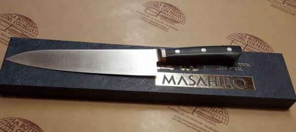 Coltello Masahiro 14911 MV-H Coltello per cuoco, lunghezza lama 210 mm. I coltelli da cucina Masahiro sono realizzati in acciaio inossidabile originale Masahiro MBS-26 (carbonio contenuto 0,85-0,95%); la lama del coltello è trattata in 3 fasi - tempra, rinvenimento e distensione - e l'acciaio inossidabile diventa incredibilmente duro con HRC da 58 a 59. Ogni lama di coltello è affilata perfettamente da artigiani con più di 30 anni di esperienza. L'impugnatura è realizzata in POM, materiale straordinariamente resistente e antibatterico che rende il coltello molto igienico nell'uso quotidiano. Confezione: scatola di cartone.