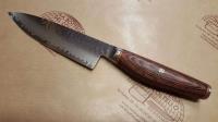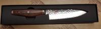 Art. 34073-161 Lama in san-mai con cuore in acciaio da metallurgia delle polveri MC63 (Takefu SG2) HRC64. Trattamento termico Cryodur®. Affilatura simmetrica. La finitura martellata della lama (Tsuchime) , oltre a rendere il coltello attraente, contribuisce ad impedire che il cibo si attacchi durante il taglio. L'impugnatura è realizzata in pakkawood la cui bellezza è sottolineata dalla spinetta centrale decorata e dagli spaziatori in ottone e rossi. Terminale in acciaio inox con logo stampato a caldo. Confezione: scatola di plastica.