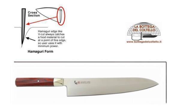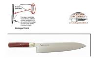 Lama in acciaio inossidabile VG-10, lunghezza lama mm 270. Affilatura leggermente asimmetrica (Hamaguri) per utilizzo con la mano destra. Impugnatura ottagonale in pakkawood sezione ellittica. Tipica confezione giapponese in legno.